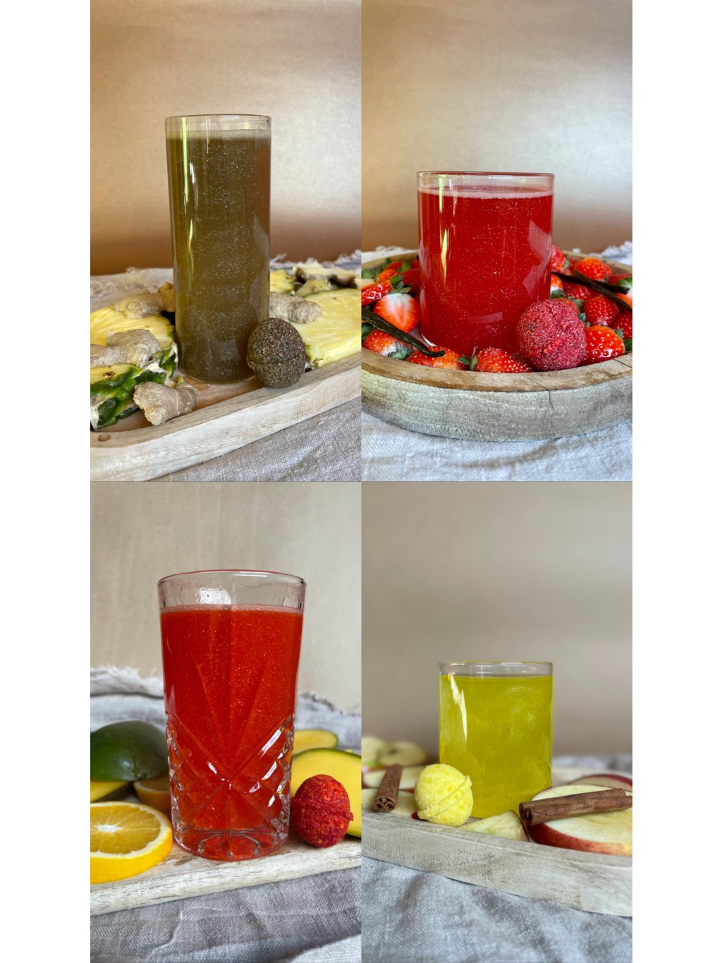 - Drinkové bomby - príchute: jahoda vanilka, dračie ovocie, čučoriedka, jablko, grinch (limetka), lesné plody