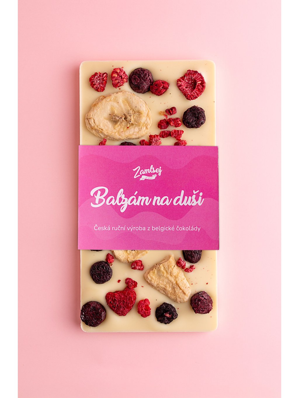 Biela čokoláda s čučoriedkami, banánmi a malinami