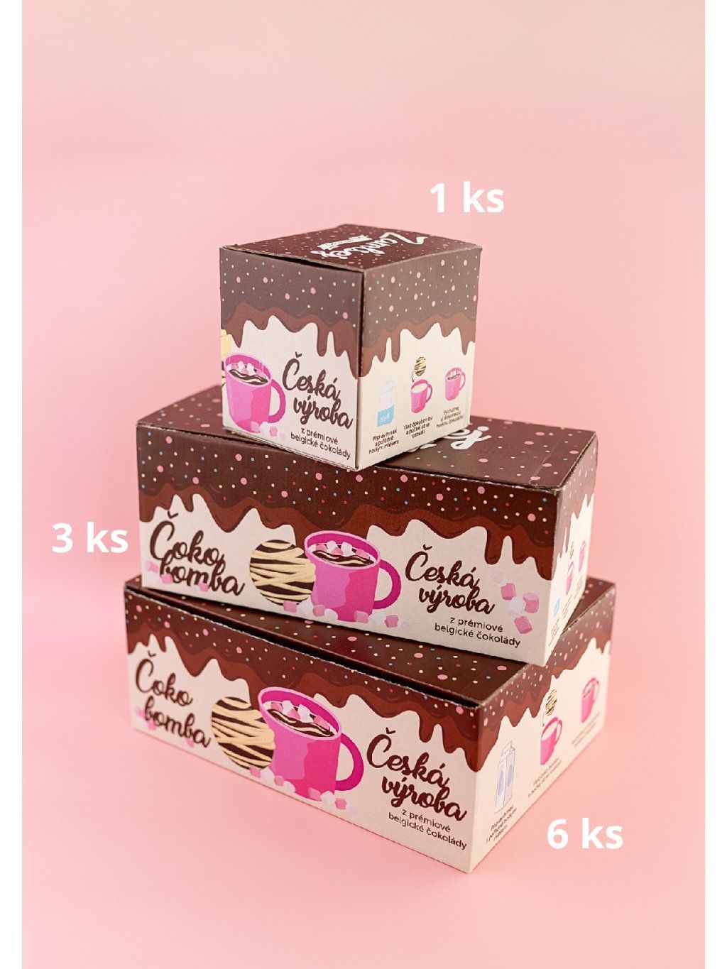 1 ks / 3 ks / 6 ks čokoládová bomba z bíle čokolády, zabalená v celofánovém sáčku a následně uložená v nádherné dárkové krabičce. Součástí krabičky je i návod na následnou přípravu horké čokolády.