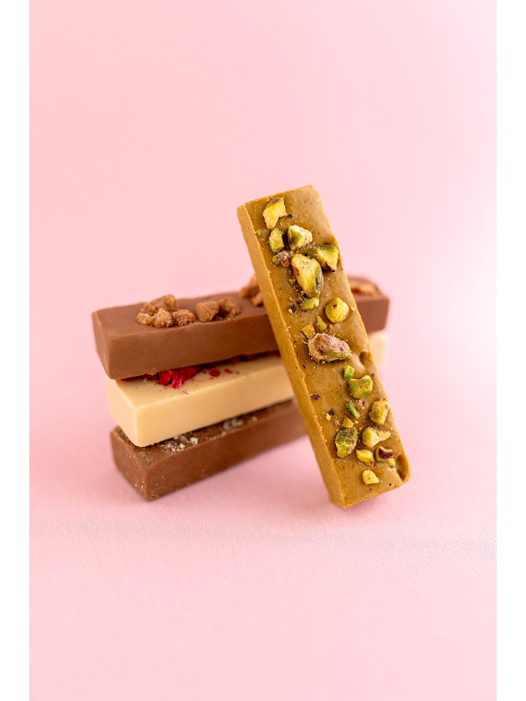 Biela čokoláda 40 % hm. (cukor, kakaové maslo, sušené plnotučné mlieko, emulgátor: sójový lecitín, prírodná vanilková aróma), 100% pistáciová pasta, sekané pistácie.