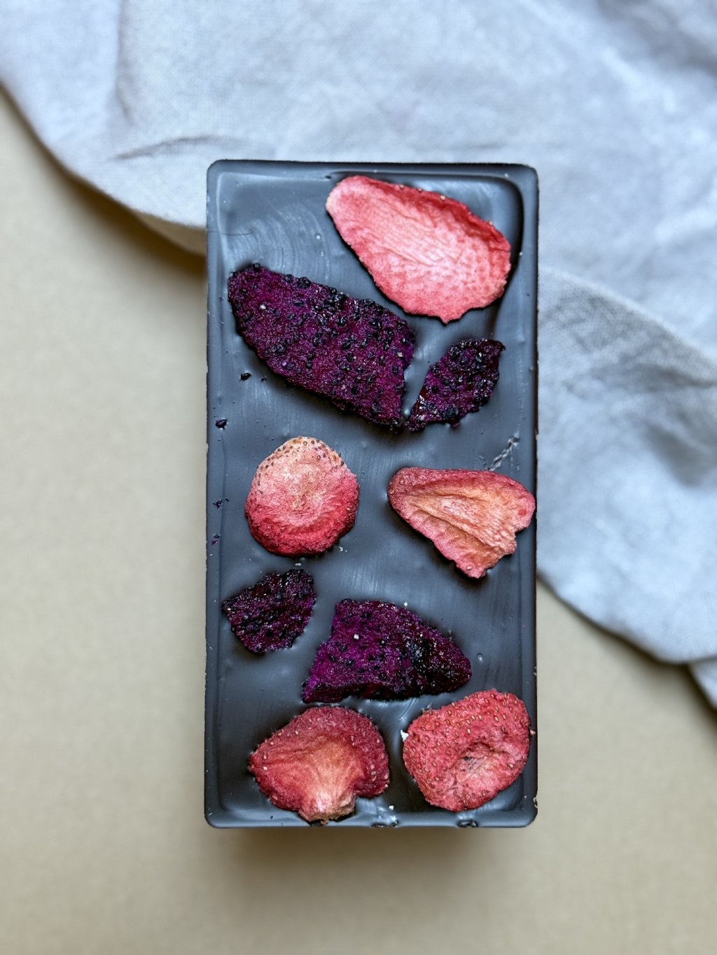 Zloženie: horká čokoláda 55,5% (kakaová hmota, cukr, kakaové máslo, přírodní vanilkové aroma), lyofilizované dračie ovocie a jahody