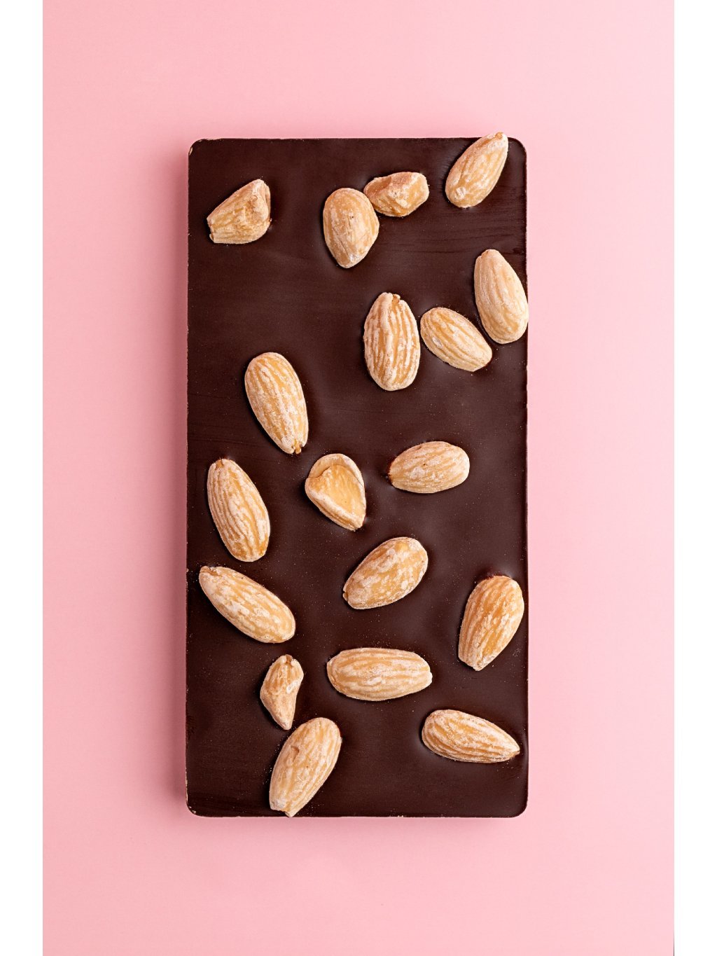 Zloženie: hořká čokoláda 55,5% (kakaová hmota, cukr, kakaové máslo, přírodní vanilkové aroma), slané mandle