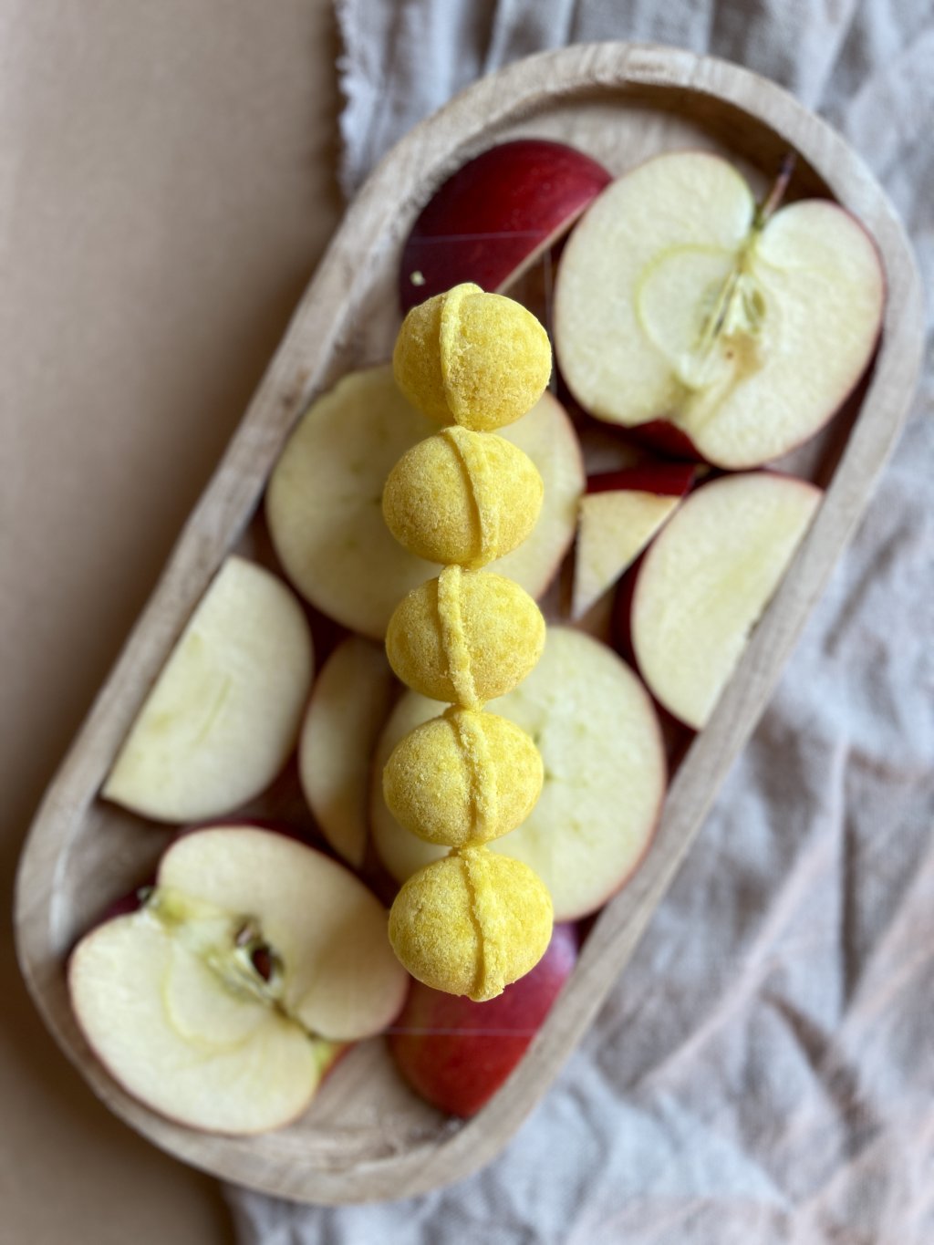Zloženie: cukor, lyofilizovaný ananás, kyselina citrónová, jedlá sóda, jablková aróma (modifikovaný kukuričný škrob, arómy), sukralóza, trblietky: Kremičitan hlinitodraselný (E555), Oxidy a hydroxidy železa (E172), Oxid kremičitý (E551), farbivá: E102*
