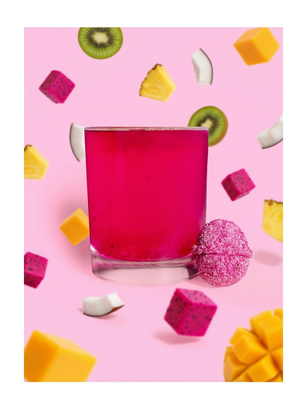 Zloženie Tropické ovocie a kurkuma: cukor, 20 % lyofilizovaný ananás, mango a dračie ovocie, kyselina citrónová, jedlá sóda, kurkuma, aróma ananásu, manga a dračieho ovocia, sukralóza