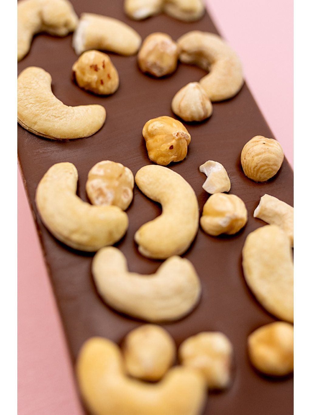 Zloženie: Mliečna 34% čokoláda (cukor, mlieko plnotučné, kakaové maslo, kakaová hmota, emulgátor: sójový lecitín, prírodný výťažok z vanilky. Obsah kakaovej sušiny v mliečnej čokoláde najmenej 34%), kešu, lieskové orechy.