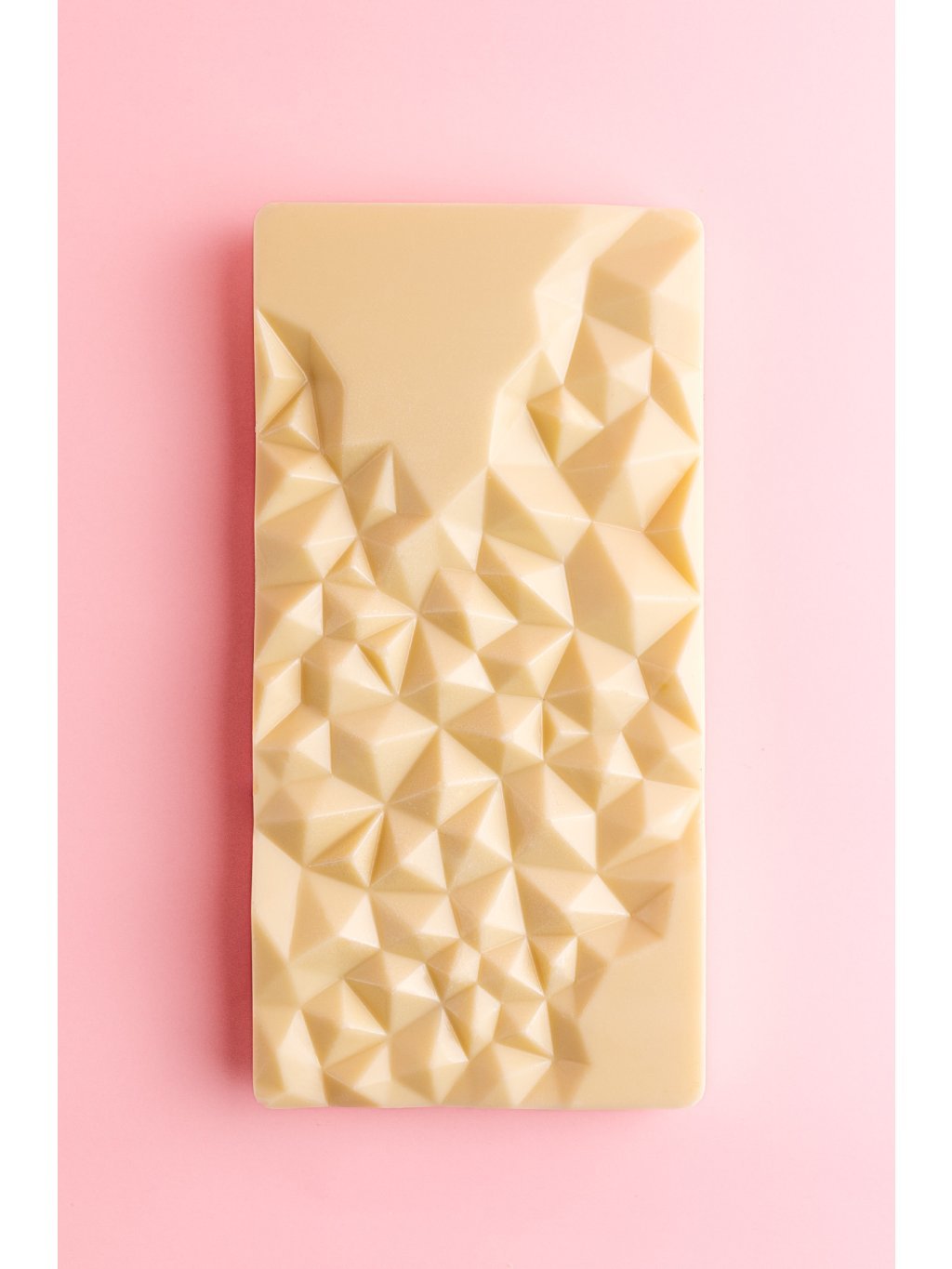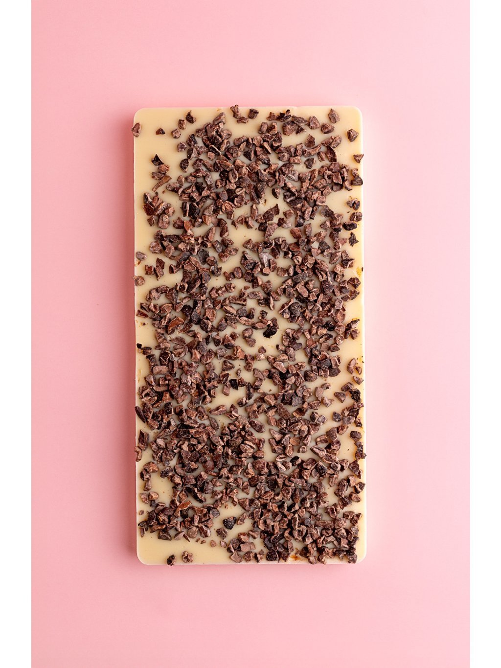 Zloženie: Biela čokoláda 40 % hm. (cukor, kakaové maslo, sušené plnotučné mlieko, emulgátor: sójový lecitín, prírodná vanilková aróma), kakaové bôby.