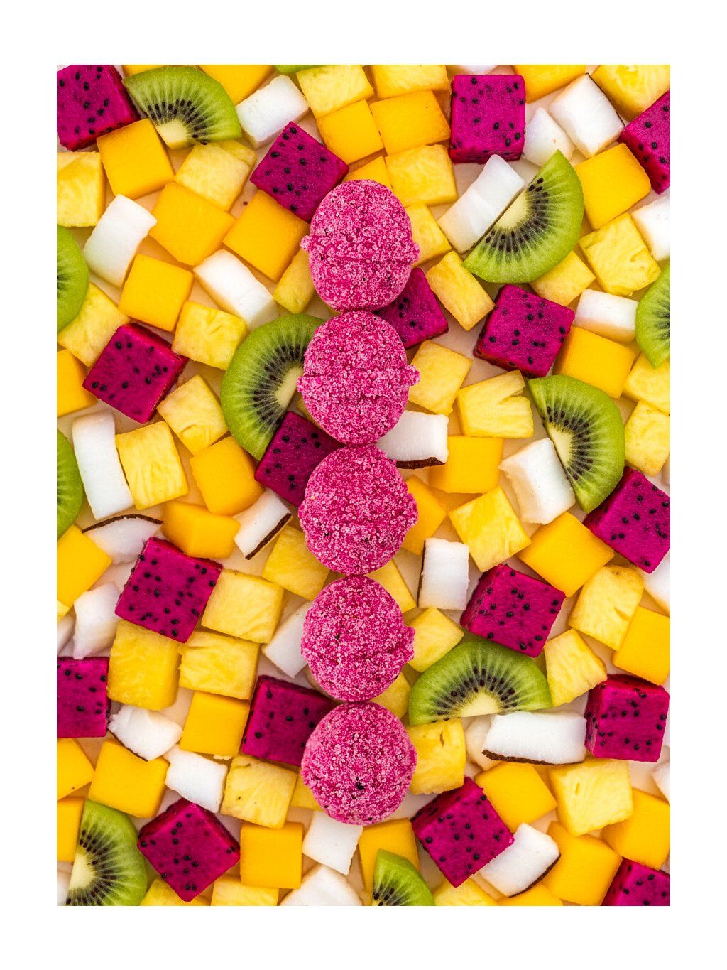 Zloženie: cukor, 20 % lyofilizovaný ananás, mango a dračie ovocie, kyselina citrónová, jedlá sóda, kurkuma, aróma ananásu, manga a dračieho ovocia, sukralóza