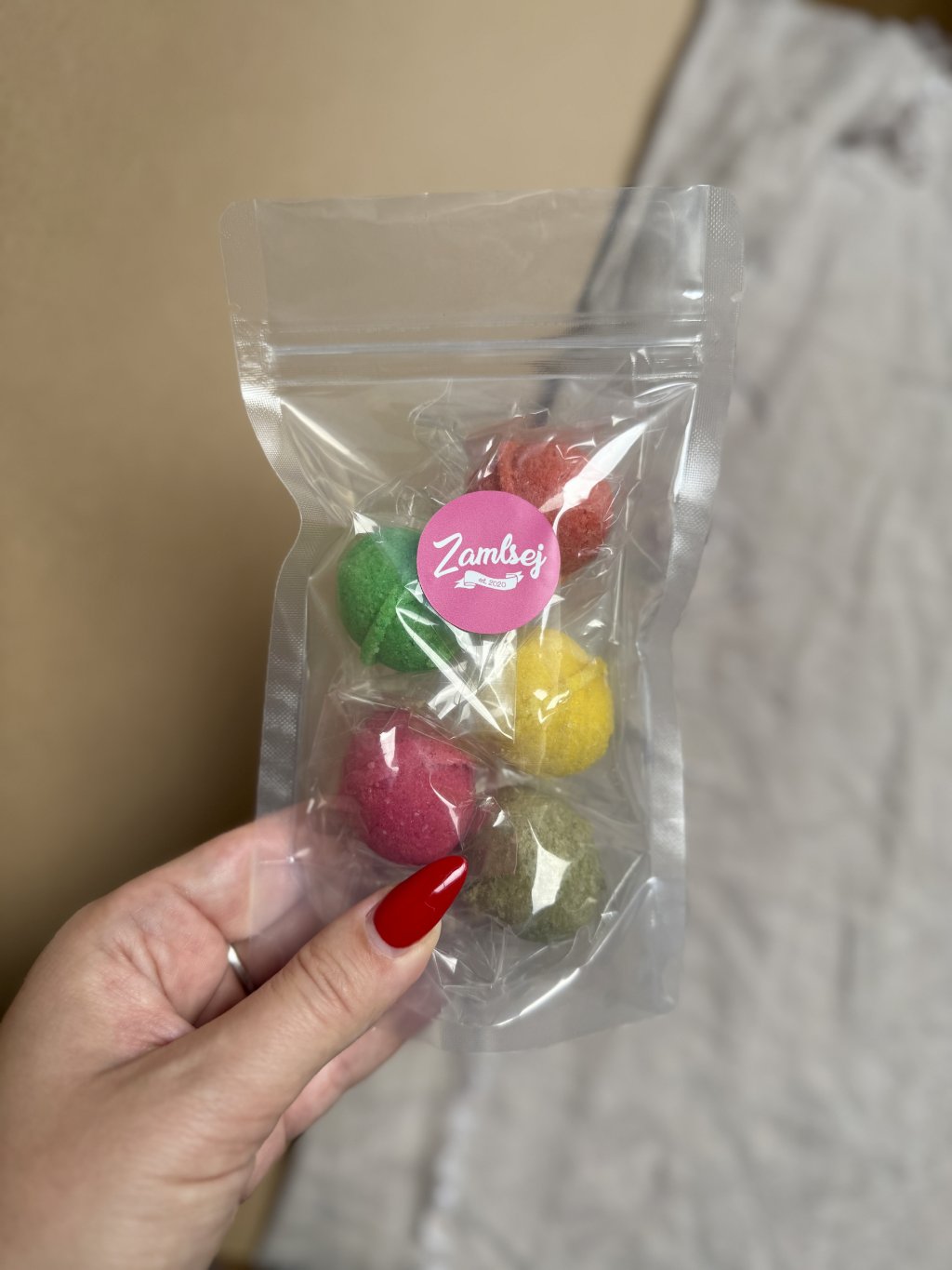 Celofánové vrecko: Bomby sú balené jednotlivo do celofánových vreciek. Toto balenie je ideálne, ak si chcete bomby objednať len tak pre seba.